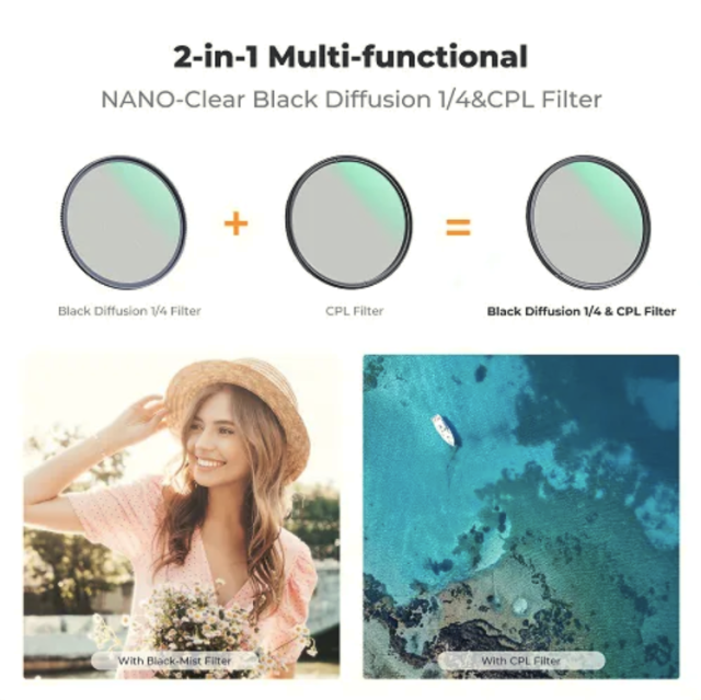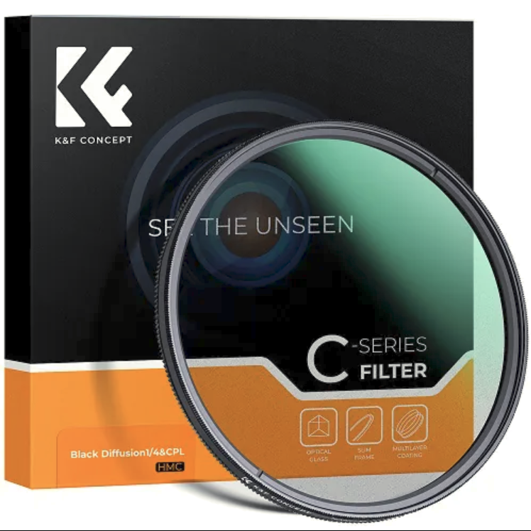 The K&F Concept 72mm Multi-functional 2-in-1 Black Mist 1/4 + CPL Filter is an innovative hybrid solution designed for creators who want cinematic softness and precise color control in a single, compact tool. This advanced filter merges the atmospheric glow of a Black Diffusion 1/4 filter with the reflection-reducing, contrast-boosting power of a Circular Polarizer (CPL). The Black Mist 1/4 element softens harsh highlights, subtly lifts shadows, and adds a dreamy, film-like quality to portraits, fashion shoots, and cinematic footage. Simultaneously, the integrated CPL helps eliminate reflections on water, glass, and metal surfaces while enriching color saturation and overall clarity—ideal for landscapes and outdoor environments. Crafted from premium Japanese optical glass with multi-layer nano coatings, the filter ensures maximum image sharpness while resisting scratches, water, oil, and unwanted reflections. Its ultra-slim aluminum alloy frame prevents vignetting even on wide-angle lenses, and the smooth rotating CPL ring provides effortless adjustments for complete creative control, making it an essential accessory for photographers and videographers seeking versatility and professional-grade results.