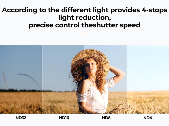 2. The ND4-ND32 neutral density filter can achieve 4-level adjustable light reduction. The intensity of the neutral density filter can be adjusted at any time according to the needs to adapt to different light environments.