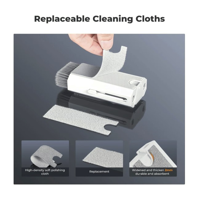 Featuring a soft retractable brush made of high-density fibers, the kit can remove dust and debris from keyboards, mobile devices, and other delicate surfaces without scratching or leaving lint. It also includes microfiber wipes for precise cleaning of screens and surfaces, a key puller for safe removal of keyboard keys, and a mobile phone holder to provide convenient support while cleaning.