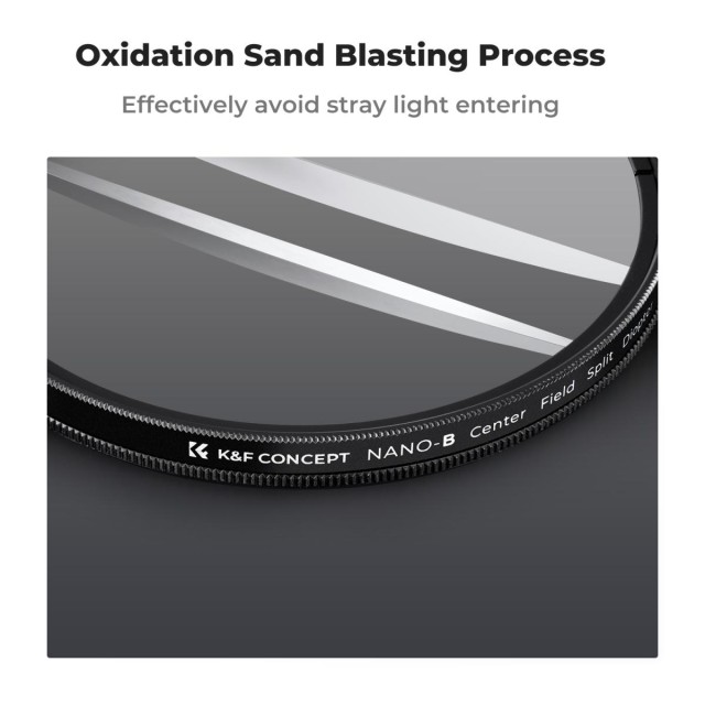 The K&F CONCEPT 82MM Centerfield Split Diopter Filter is the perfect tool for photographers looking to add unique creative effects to their images. This specialized filter blurs the foreground and creates a refraction effect at the edges, emphasizing your main subject and adding a sense of depth and dimension to your photos. Crafted from high-quality Japanese AGC optical glass, it offers excellent light transmittance and vibrant, accurate color reproduction for crystal-clear results. The adjustable frame allows you to rotate the filter to achieve the desired effect, while the oxidation sandblasted surface minimizes stray light. Perfect for landscape, portrait, and artistic photography, this filter also comes with a vacuum-packed microfiber cleaning cloth, ensuring safe and convenient maintenance.