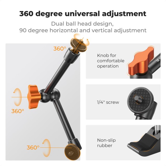 The K&F Concept 9.8" Magic Arm with clamp can be used with various photographic accessories. Whether you're shooting from above or from a low angle, this arm allows you to discover new angles.