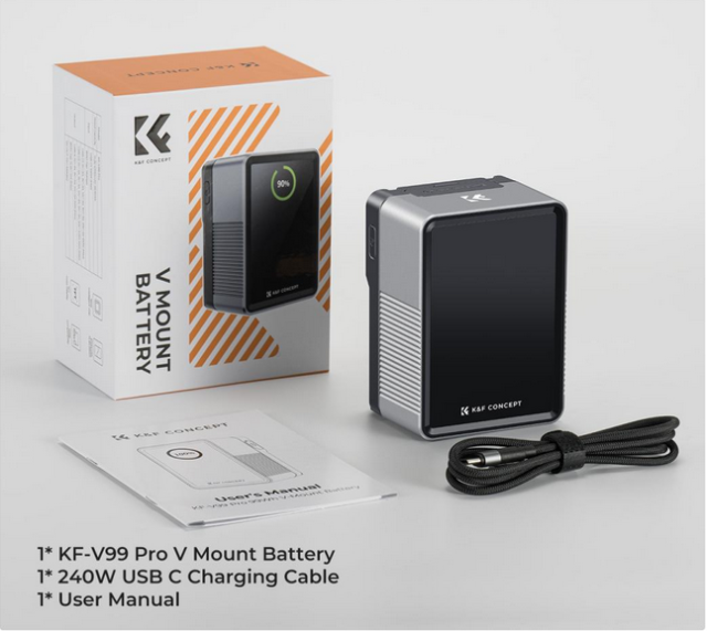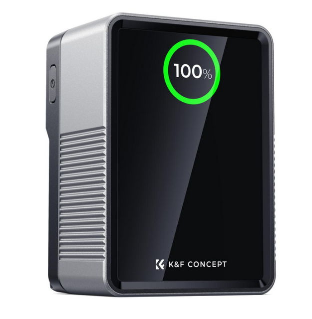 The K&F Concept 99Wh Pro Mini V Mount Battery is an essential power solution for photographers and videographers on the move. With a 99Wh capacity and 6700mAh at 14.8V, it is air travel-friendly, meeting carry-on regulations. Equipped with advanced 100W PD USB-C technology, this battery ensures fast recharging and the ability to efficiently power laptops, smartphones, and other devices. Its extensive connectivity options include two USB-C ports, one USB-A port, one DC port (12V, 5.5x2.5mm), BP, and D-TAP ports, making it a versatile power hub. The real-time TFT color display provides clear monitoring of output power and battery status. Built with durable aluminum alloy and fire-resistant PC, it also features an emergency night light for convenience in low-light conditions, ensuring reliability in demanding environments.