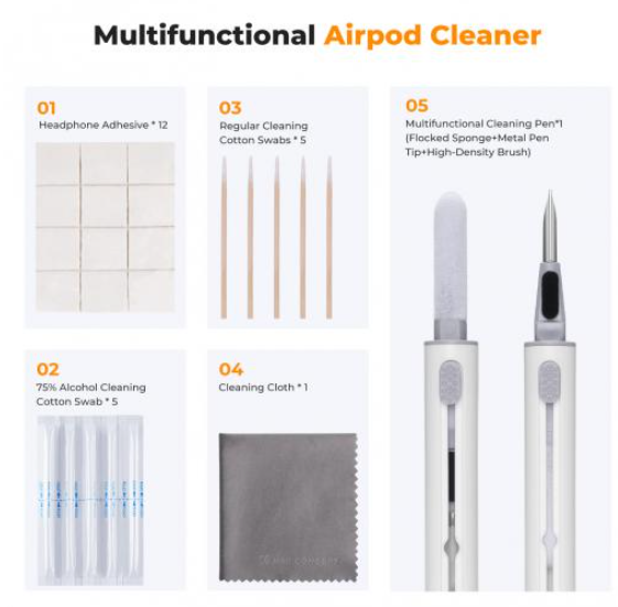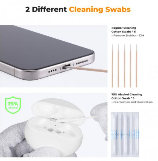 The K&F Concept Airpod Cleaner Kit is a comprehensive, portable hygiene solution for Bluetooth earphones like AirPods, featuring a 3-in-1 multi-function pen that integrates a soft density brush for scrubbing stubborn dirt on headphone exteriors and storage cases, a flocking sponge tip for gentle surface wiping, and a memory cotton stick (expandable foam, 2 cm length) for deep-cleaning oil and dust from earphone compartments without residue. The adhesive pull-tab mechanism (silicone-based, non-residue) adheres to sound outlet filters to extract embedded particles upon removal, while the included alcohol swab (75% isopropyl, pre-moistened cotton tip) denatures bacterial proteins, effectively eliminating 99% of common pathogens like staphylococci and E. coli for hygienic disinfection. A finishing microfiber cloth (3 x 3 inches, 200g/m² lint-free fabric) polishes surfaces to a streak-free shine, ensuring the kit covers all cleaning needs—from initial stain removal to final buffing—in a compact, travel-ready package (total weight 50 g, dimensions 15 x 2 cm folded). Safe for delicate electronics with non-abrasive materials (Shore A 40 sponge, electrostatic-free brush), it prevents bacterial buildup from prolonged use, promoting a healthier audio experience for daily commuters or fitness enthusiasts.