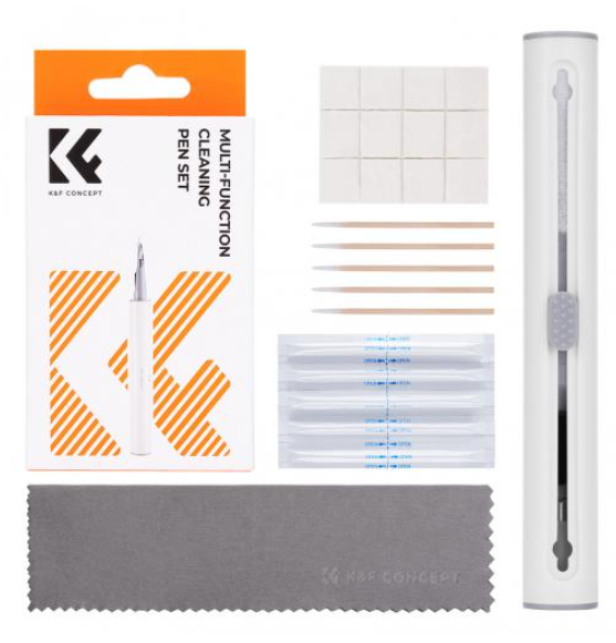 The K&F Concept Airpod Cleaner Kit is a multi-function 3-in-1 cleaning pen with soft brush, flocking sponge, memory cotton stick, adhesive pull-tab, alcohol swab, and microfiber cloth, designed for thorough Bluetooth earphone maintenance. It removes oil, dust, stains, and bacteria from surfaces, sound outlets, and compartments, restoring hygiene and shine to AirPods or similar devices.