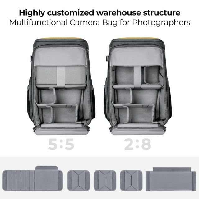 Introducing the innovative Magic Bin Photography Backpack featuring a customizable 5:5 and 2:8 space design for various photography needs, including outdoor, street, and portrait photography. It ensures stability with concealed internal support fiber reinforcement bars, and the front width expansion allows for a capacity increase of 2-3L. The top and side access, along with a suspended 16-inch computer compartment, offers convenience and safety, preventing direct computer bumping. Ideal for photographers seeking versatility and protection for their equipment.