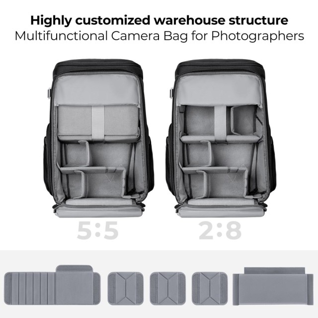K&F Concept's photography backpack features a versatile "Magic Bin Design" for adjustable space, making it suitable for various photography scenarios. With stable internal support, capacity expansion, top and side access, and a suspended computer compartment, it ensures safety and convenience for photographers, especially those engaged in outdoor and portrait photography.
