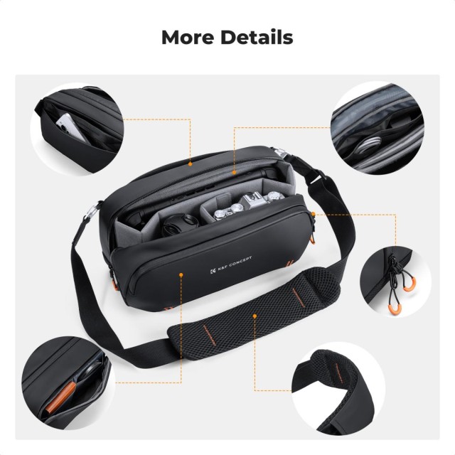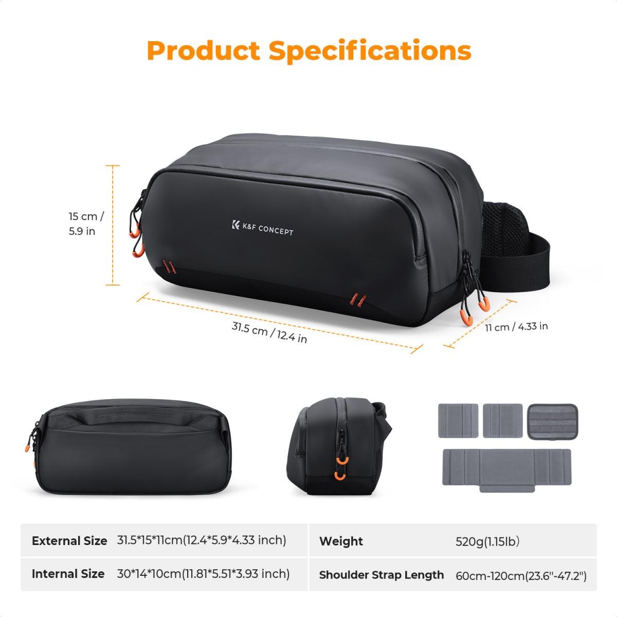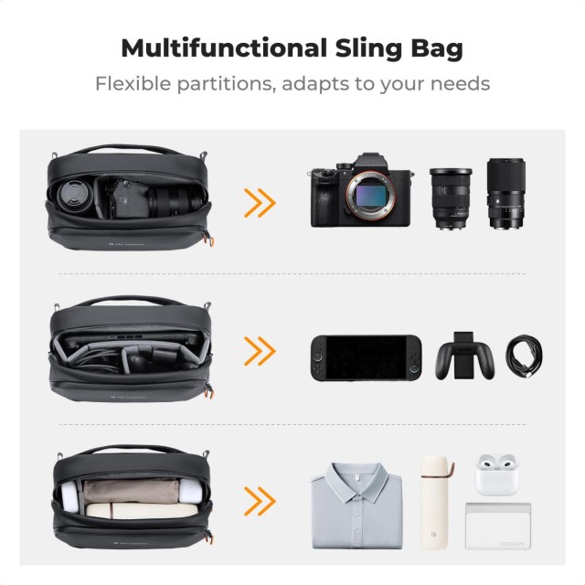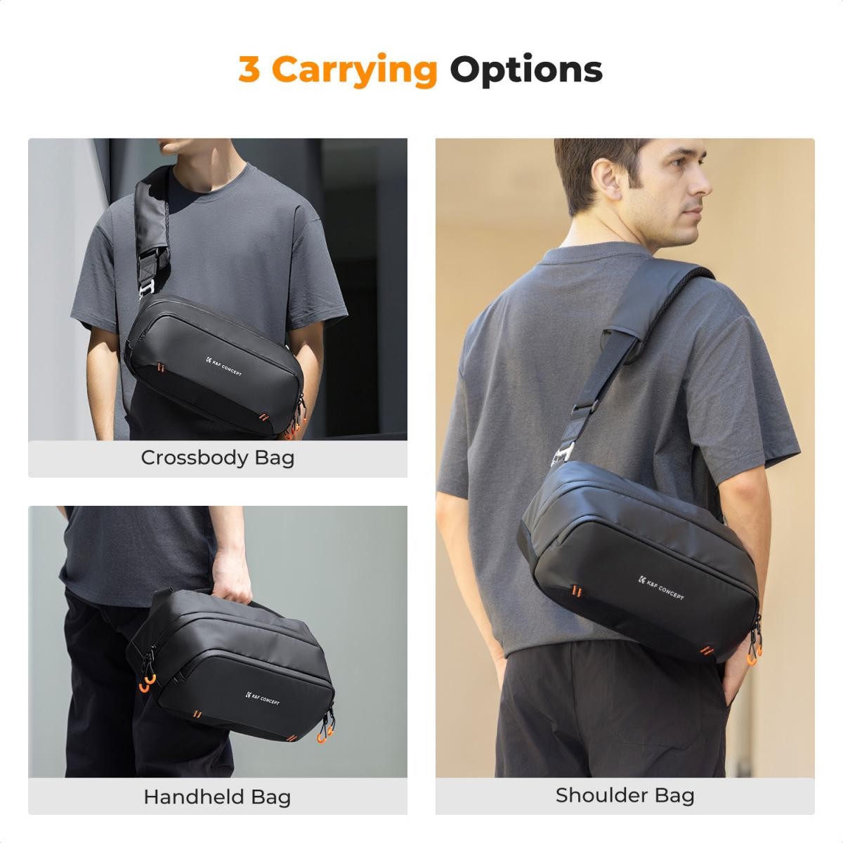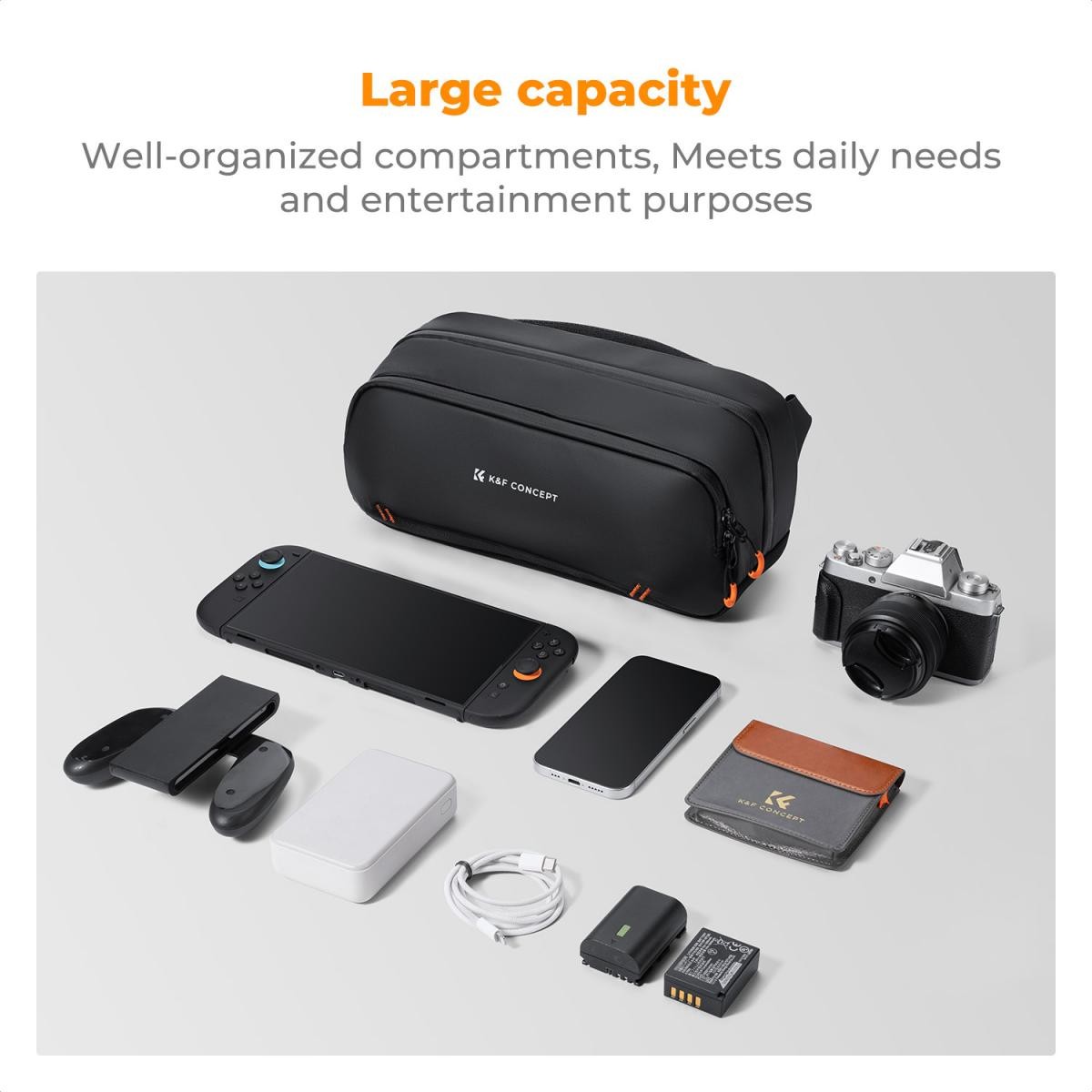 K&F Concept Digital Storage Sling Bag: Versatile all-in-one tech bag for creators, fitting Steam Deck, DJI Pocket 3, mirrorless cameras, and essentials with customizable dividers, water-repellent protection, and three-way carry options.