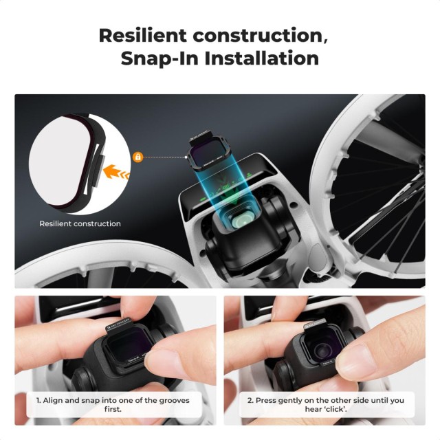 The filters feature a snap-on system that fits perfectly on the DJI Flip 4K UHD camera. Simply snap them on and you can start shooting from the air right away.
