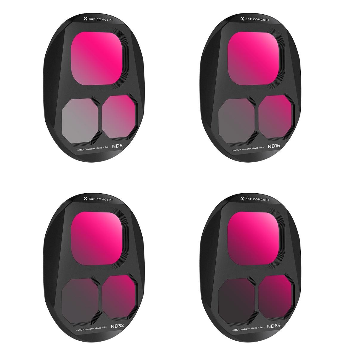 The K&F CONCEPT ND Filter Kit for DJI Mavic 4 Pro includes four essential neutral density filters (ND8, ND16, ND32, ND64) designed to precisely control light intake in bright shooting conditions. Built with HD AGC optical glass and double-sided nano coatings, this kit delivers true color reproduction, reduced glare, and full protection while remaining completely gimbal-safe.