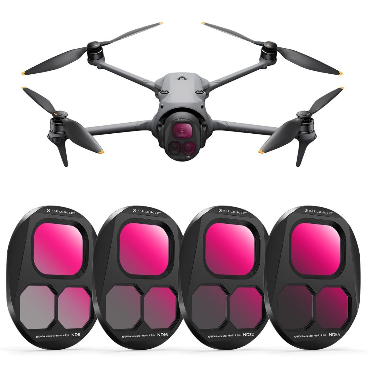 K&F CONCEPT DJI Mavic 4 PRO ND filter kit SKU1640 features ND8 ND16 ND32 and ND64 lenses for precise exposure control. Enjoy stunning aerial photography and videography with these professional grade HD lenses. Their double sided coating offers enhanced durability and is waterproof for reliable use in any condition.