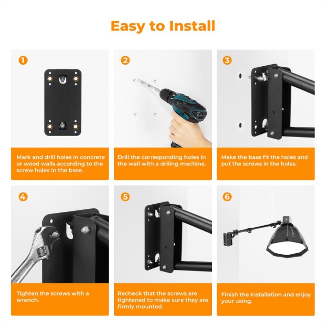 - * 【Secure Installation】Constructed from robust, corrosion-resistant metal with a black finish, this boom arm ensures durability and strength. It comes with four expansion screws for secure mounting on concrete walls, providing a stable and safe setup.