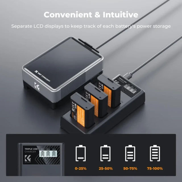 K&F Concept LP-E10 Battery 3-Pack and Upgraded LCD Charger. The three slot charger can efficiently charge 3 pcs LP-E10 batteries simutaneouly, and the LCD screen clearly shows the charging status of each battery.