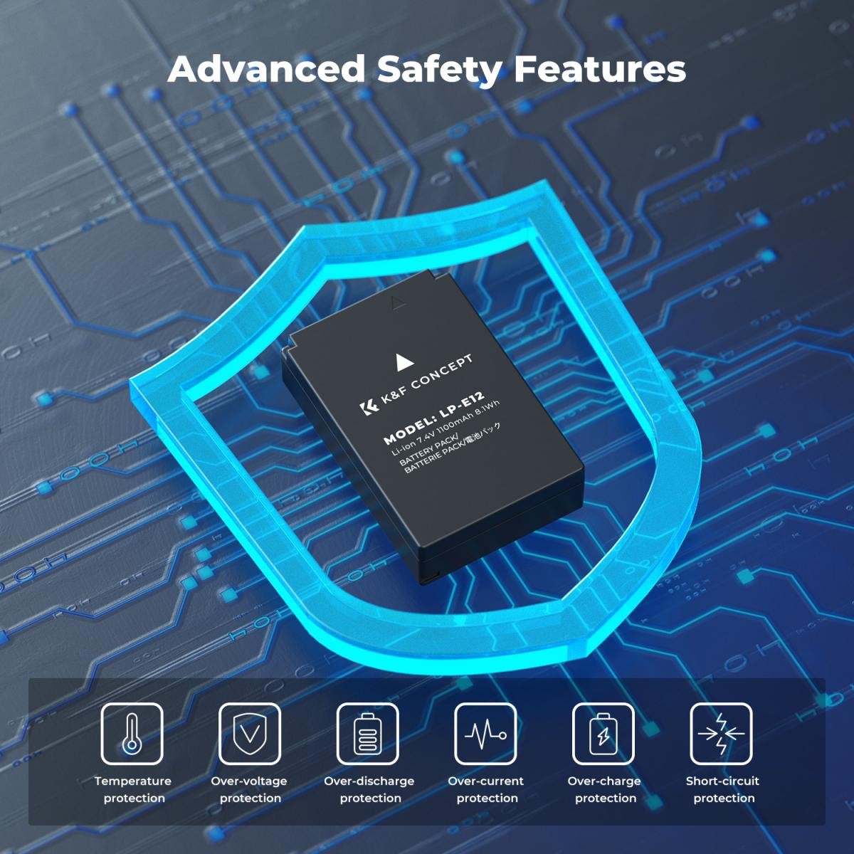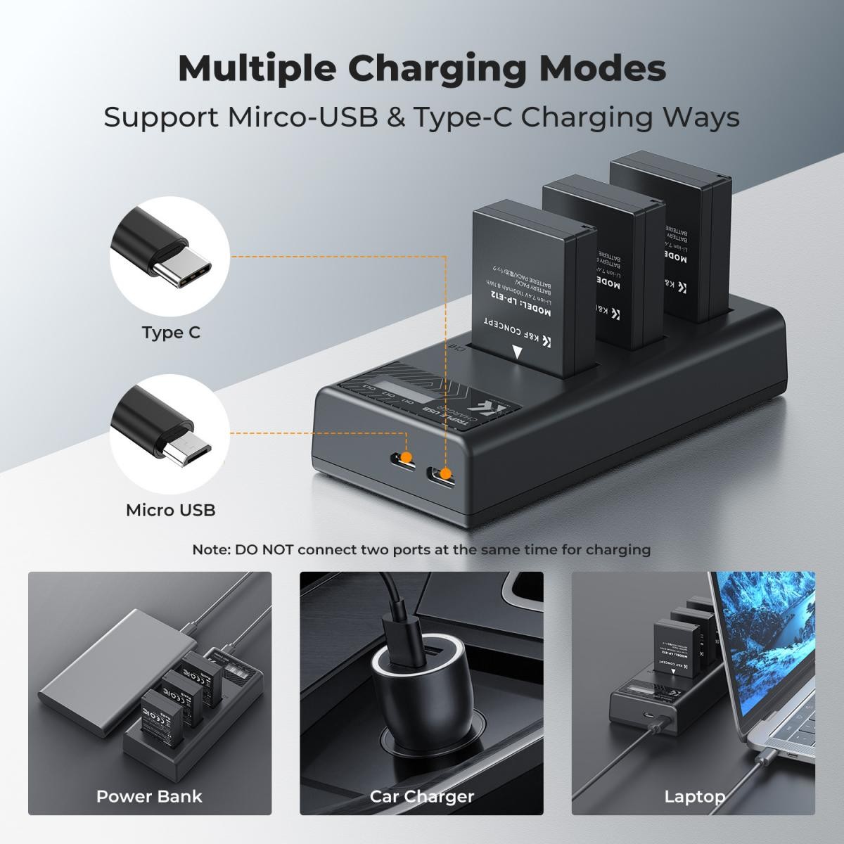 The LP-E12 battery charger set includes 3pcs EOS M50 batteries (rated 1100mAh, 7.4V, 8.8Wh) and a triple-slot LCD charger, ensuring continuous power for extended shooting sessions. The three slot charger can efficiently charge 3 pcs EOS M50 batteries simutaneouly, and the LCD screen clearly shows the charging status of each battery.