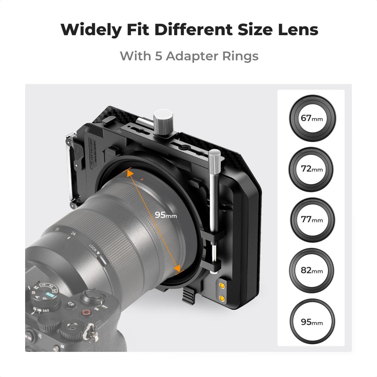 - 【Comprehensive Compatibility】Equipped with 5 adapter rings (67/72/77/82/95mm) to fit most DSLR and mirrorless lenses. It also includes multiple expansion ports (1/4", 3/8", cold shoe) for installation of more accessories and further enrich the shooting experience.