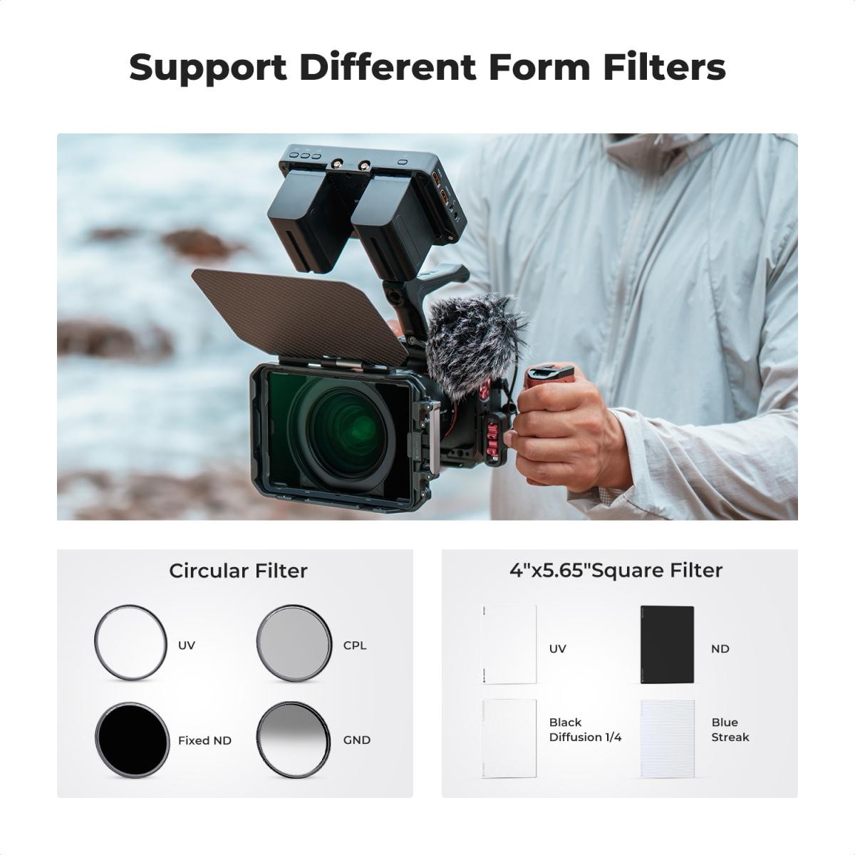 - 【Versatile and Secure Filter System】The matte box can hold two 4x5.65" 4mm thick filters and includes a secure locking mechanism. Meet the shooting needs in different scenes.