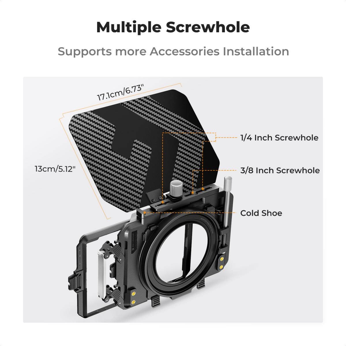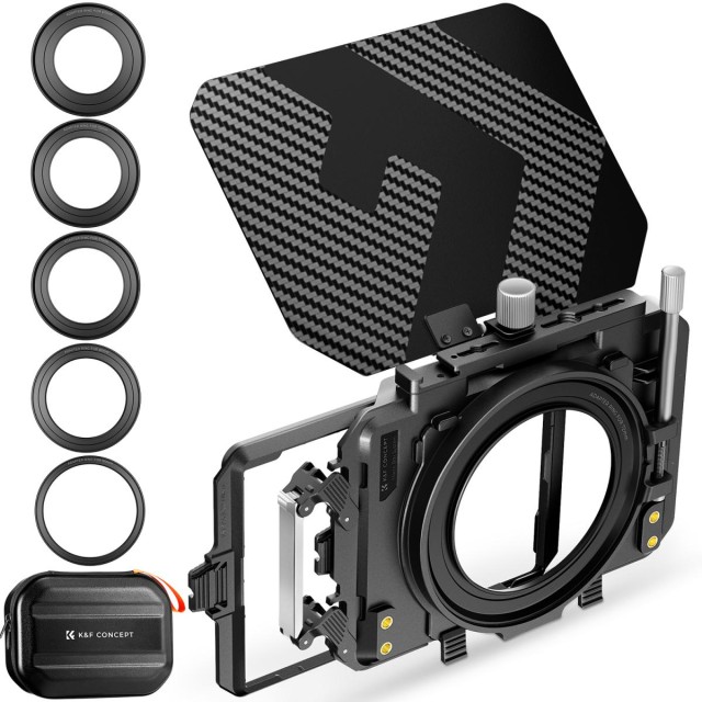 K&F Concept Matte Box Kit: Lightweight carbon fiber matte box with 5 adapter rings (67/72/77/82/95mm) + 2 filter trays for 4x5.65" filters—anti-stray light, vignette-free for 16mm lenses, expandable with ports and storage bag.