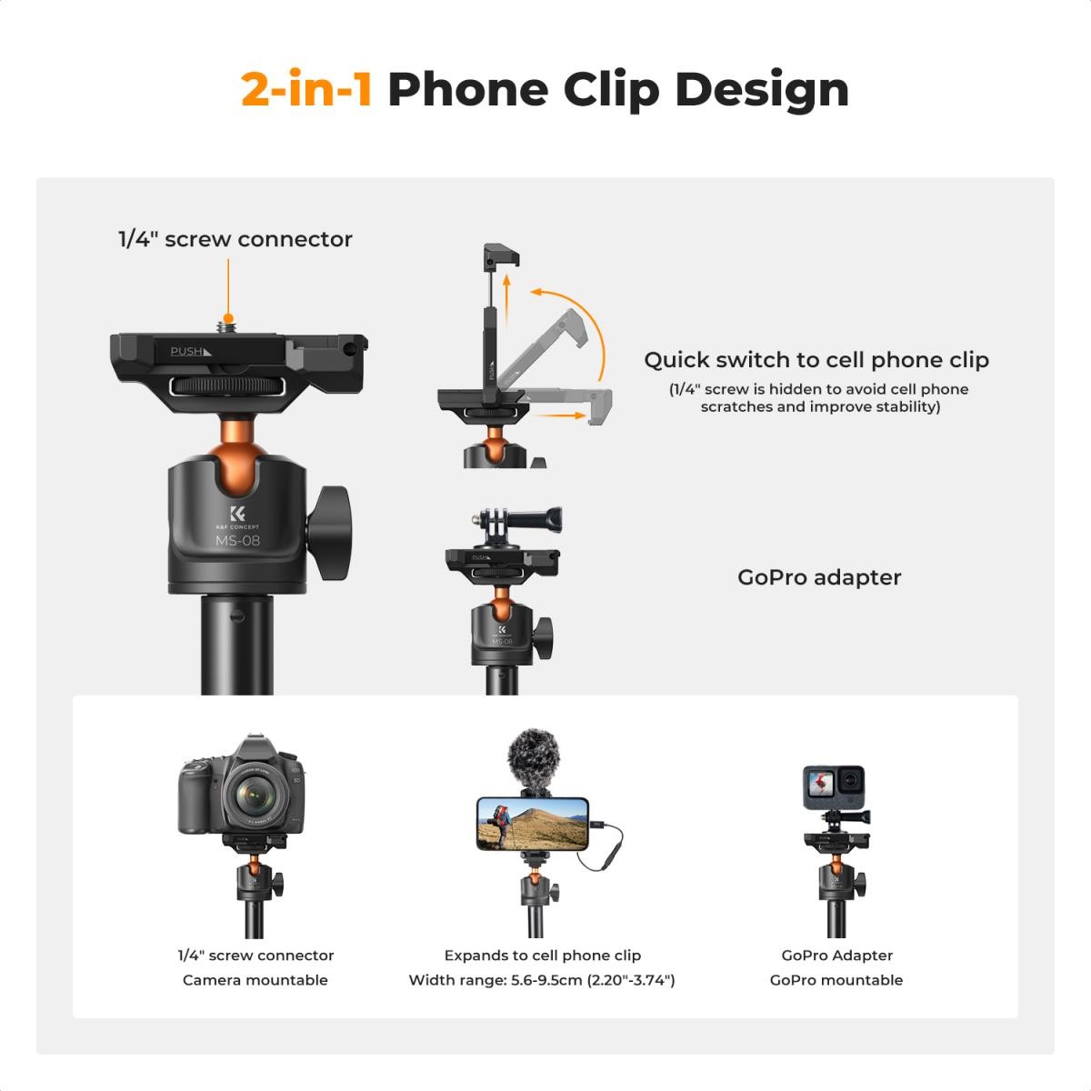 The K&F Concept MS08 tripod is designed for photographers and content creators seeking a compact yet highly adaptable solution. With a maximum height of 157.8cm and 7-section adjustable legs, it allows precise height adjustments to suit any shooting scenario. The tripod supports a load of up to 3kg, making it ideal for most mirrorless cameras, smartphones, and action cameras. It features a 360° rotatable spherical head and 90° vertical tilt, enabling full-range shooting from landscapes to sports scenes. A 1/4-inch interface ensures compatibility with a wide range of devices, while its lightweight design (only 97g) makes it highly portable. The tripod comes with a free Bluetooth remote, allowing mobile users to capture photos and videos from up to 10 meters away, with a continuous battery life of up to 10 hours. Additionally, the included GoPro adapter makes it compatible with GoPro, DJI Osmo Action, and Insta360 cameras, making the MS08 a versatile choice for all kinds of photography and videography needs.