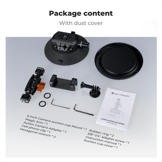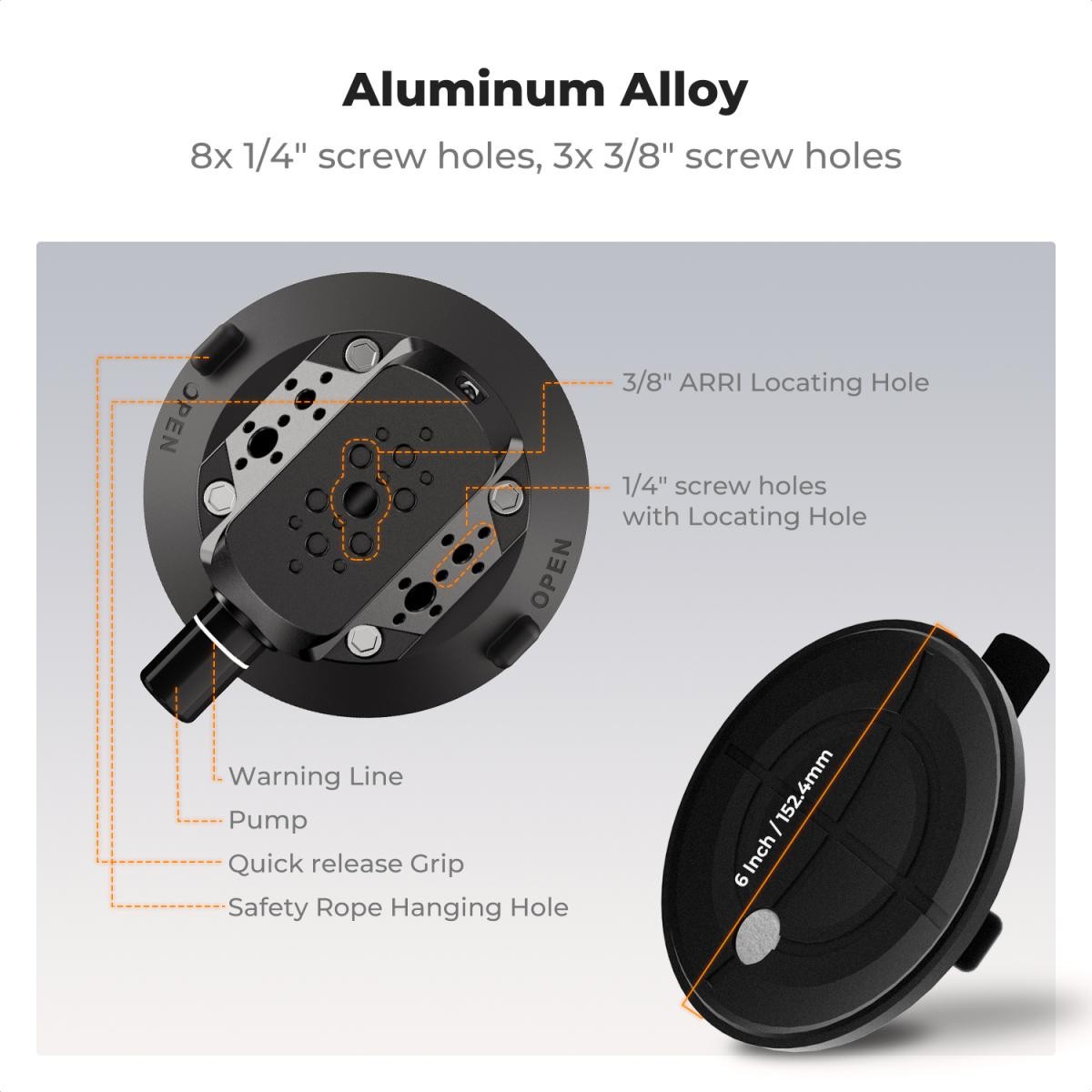 The K&F Concept MS46 is a professional-grade vacuum suction cup mount engineered for stability and versatility. Featuring a 6" (152mm) large rubber suction cup, it utilizes a vacuum pump design to create a strong and reliable hold on smooth surfaces, including car windows, hoods, tiles, and polished wood. The mount’s metal interface comes equipped with both 1/4" and 3/8" screw holes, allowing connection to accessories such as magic arms, pea pods, mobile phone clamps, fill lights, sports cameras, and panoramic cameras. Its 360° multi-angle adjustment provides flexible shooting angles, unlocking creative possibilities for photography and videography. The vacuum pump includes a warning indicator, ensuring safe and effective suction by signaling when the vacuum is fully engaged. This mount is perfect for professionals and enthusiasts seeking a secure, adaptable, and high-quality mounting solution.