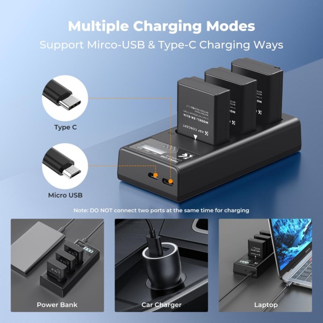 The kit features a 3-slot LCD battery charger, allowing simultaneous charging of three batteries while displaying the charging status of each on a clear LCD screen. The charger supports dual input via Micro USB or Type-C (5V/2.1A), making it compatible with wall adapters, car chargers, laptops, and other USB power sources. Using Type-C input, all three batteries can be fully charged in approximately 3.8 hours.