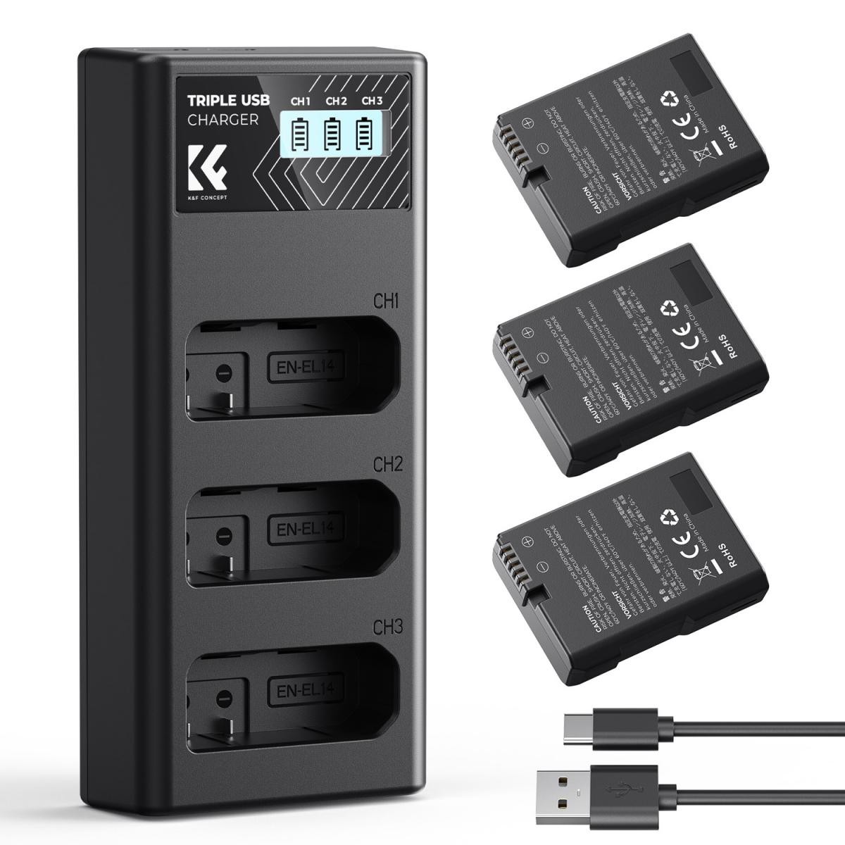 K&F Concept 3-Pack Nikon EN-EL14 Camera Batteries with 3-Slot LCD Charger. Includes 1050mAh EN-EL14 batteries and an LCD display charger with dual Micro USB/Type-C input for fast, safe charging.
