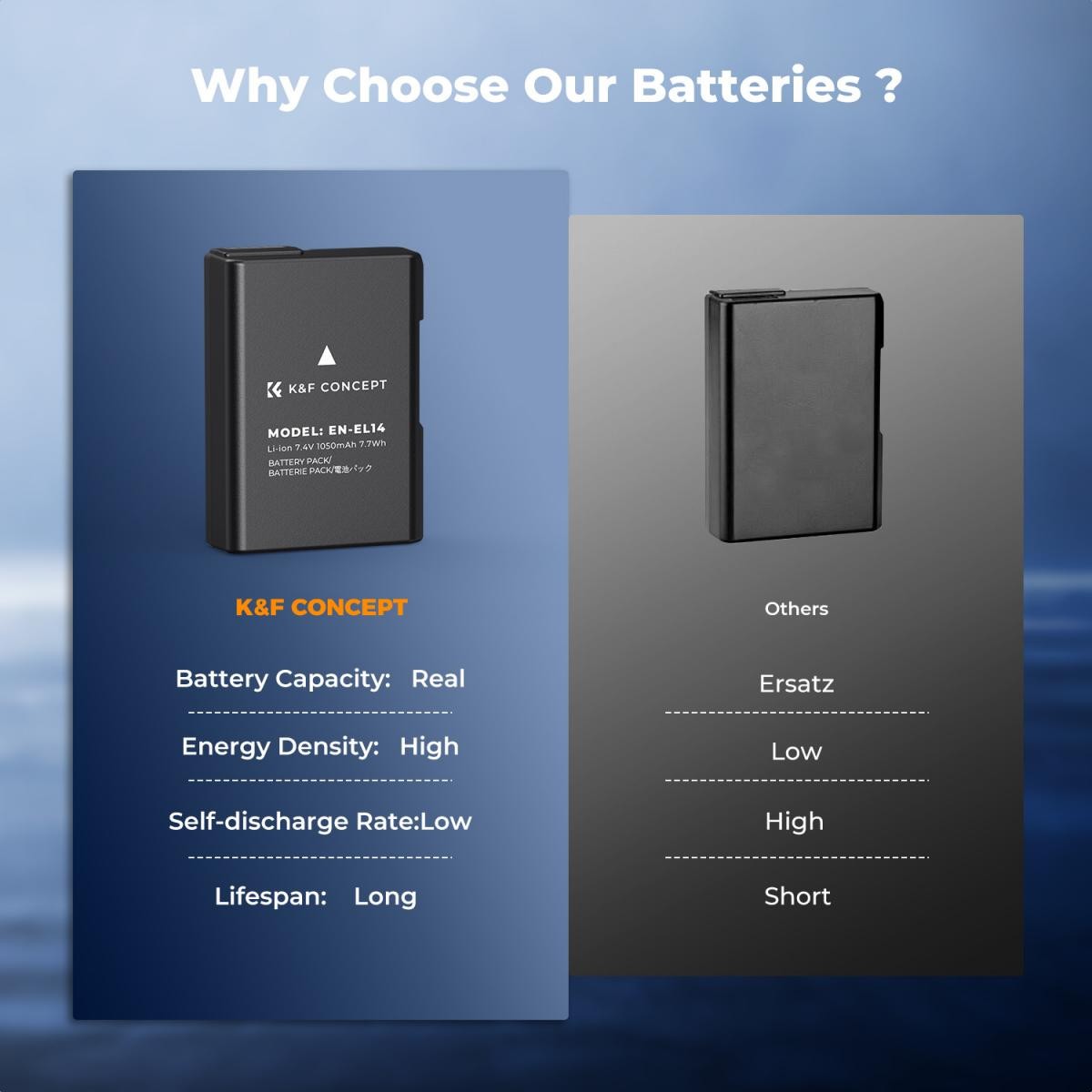 The K&F Concept Nikon EN-EL14 battery kit provides 3 high-capacity 1050mAh, 7.4V EN-EL14/EN-EL14a batteries, delivering long-lasting power for uninterrupted shooting with Nikon cameras. Compatible with models including D5600, D5500, D5300, D5200, D5100, D3500, D3400, D3300, D3200, D3100, Coolpix P7000/P7100/P7200/P7700/P7800, and other EN-EL14 powered devices.