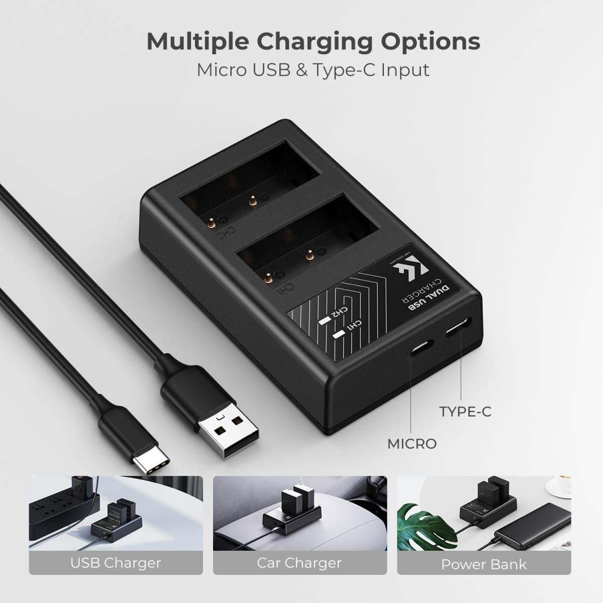 The fully decoded batteries ensure standard compatibility and seamless communication with supported cameras, while also supporting original Fujifilm chargers. The included dual-channel charger allows you to charge two batteries simultaneously and features both Micro-USB and USB-C input ports for versatile charging. Power the charger via a power bank, USB wall adapter, laptop, or car charger for maximum convenience.