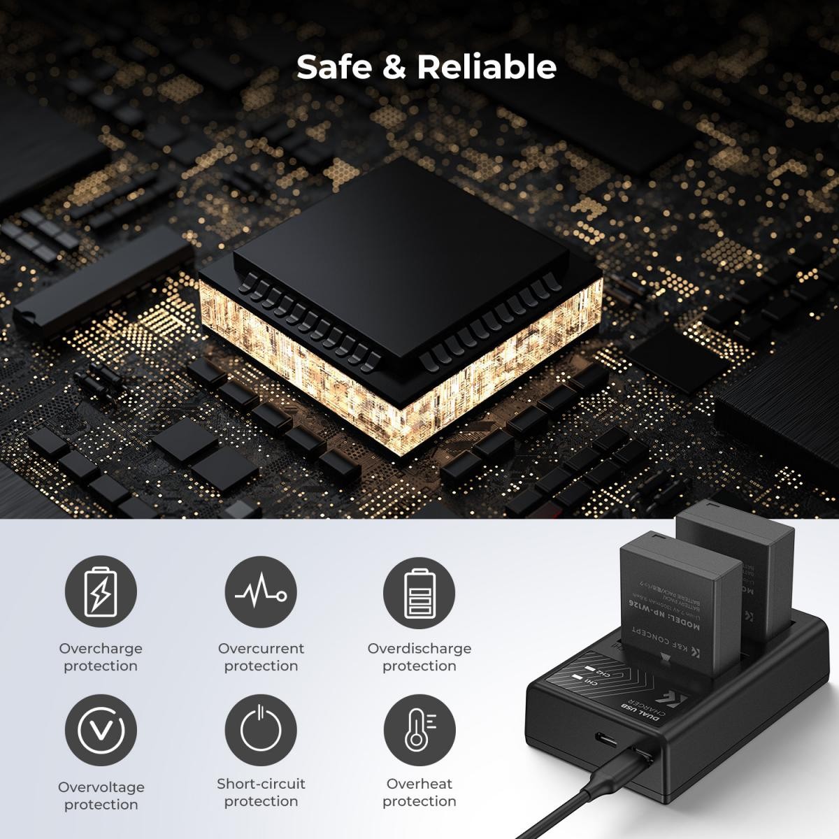 Built with an intelligent safety protection system, the charger and batteries include safeguards against overcharging, overheating, overcurrent, overvoltage, and short circuits, ensuring safe and reliable operation wherever you shoot.