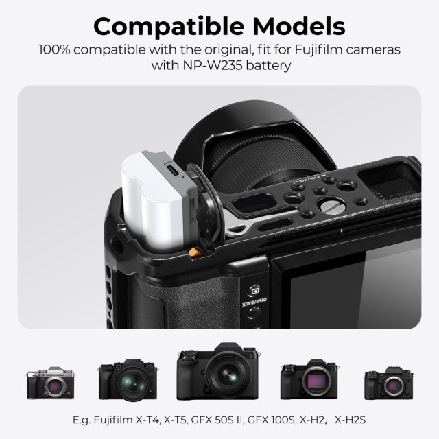 NP-W235 replacement battery, this is perfectly compatible with fujifilm cameras X-T4, X-T5, GFX 50S II, GFX 100S, X-H2, X-H2S, with over-voltage protection, over-shooting protection and other multiple safety protections. The included Type C charging port can be directly connected to the adapter for charging using the included USB Type A to Type C charging cable, no need for an external charger, travel light.