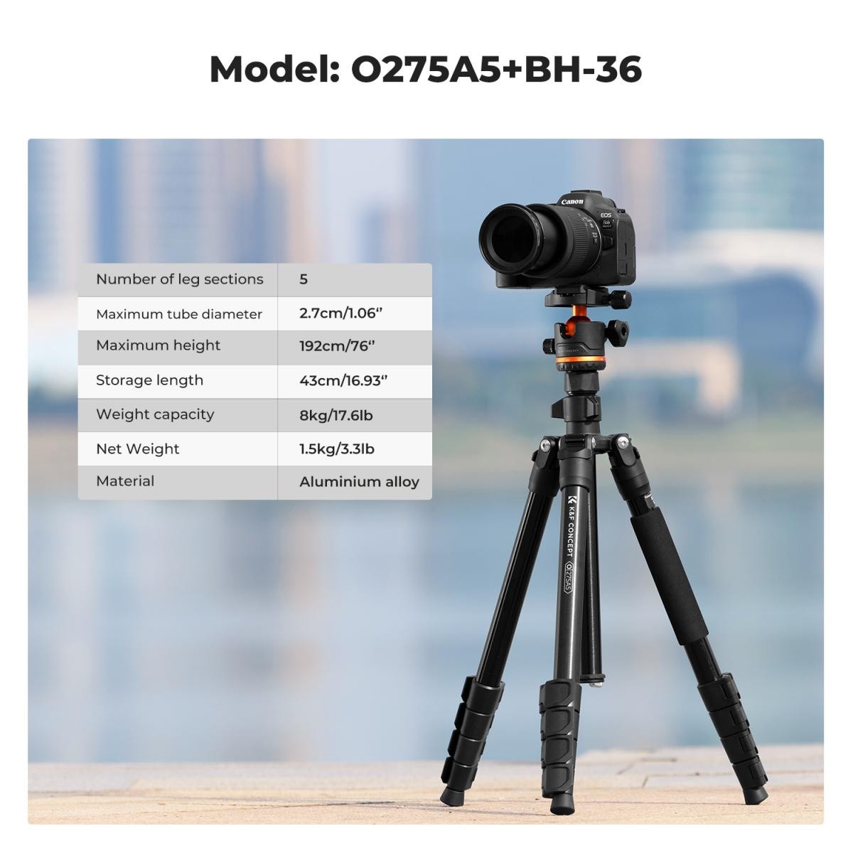 The K&F CONCEPT O275A5+BH-36 is a versatile telescopic rod tripod with a detachable monopod, designed for photographers and content creators who need stability, flexibility, and wide device compatibility. Its robust 36 mm ball head, flip-lock legs, and portable design make it ideal for shooting with smartphones, tablets, mirrorless cameras, and DSLRs.