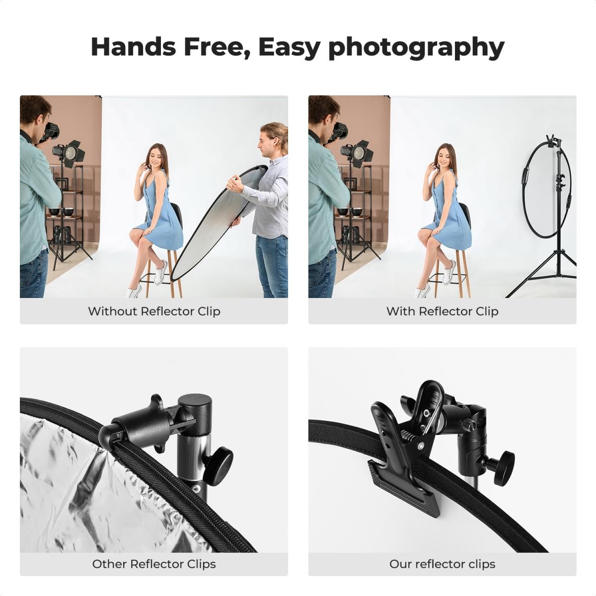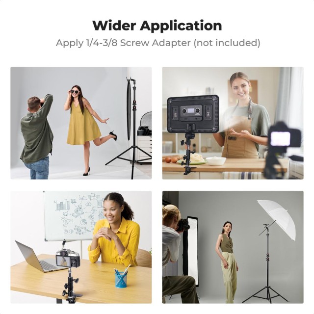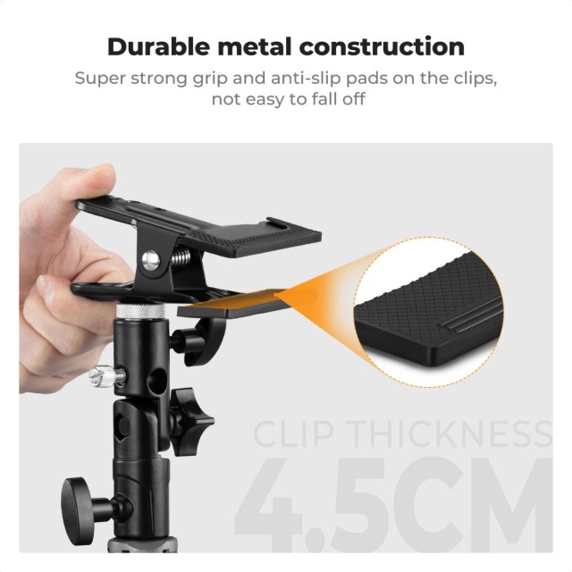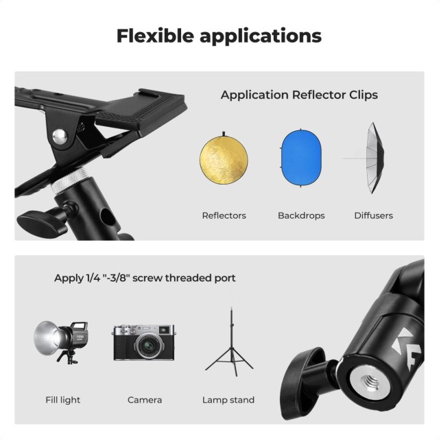 The K&F CONCEPT Heavy-Duty Photography Reflector Bracket features a strong metal clip, anti-slip padding, and a universal 5/8" base, allowing photographers to securely mount reflectors or umbrellas without an assistant for stable, convenient lighting control.