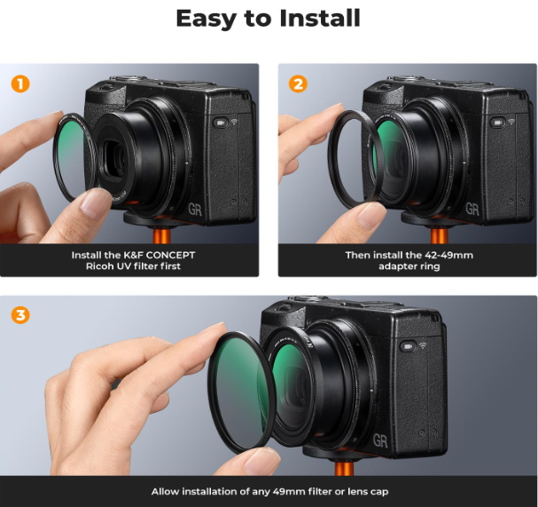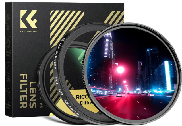 The K&F Concept Black Diffusion 1/4 + MCUV Protection Filter Kit with 42-49mm Adapter Ring is a tailored two-filter combo for Ricoh GR IIIx, GR IIIx HDF, GR III, GR III HDF, and GR II compact cameras, blending essential UV protection with cinematic black diffusion effects. The multi-coated UV filter blocks ultraviolet rays to curb bluish casts and shields against dust/scratches, while the 1/4 diffusion softens skin imperfections, adds dreamy flares, and reduces contrast for a flattering, film-like glow—all in ultra-slim 1.8mm frames using premium AGC glass to ensure high transmission without vignetting.