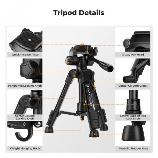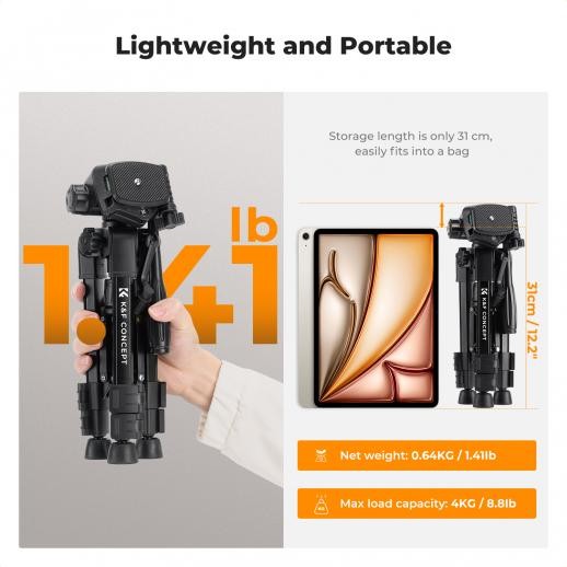 The K&F Concept S233A0 is a compact and lightweight tripod designed for photographers and videographers who need portability without sacrificing stability. Its special-shaped ABS + aluminum alloy leg tubes are stronger and more compact than traditional round tubes, making it ideal for travel and on-the-go shooting. The tripod folds down to just 30cm and weighs only 638g, yet it can support loads up to 4kg, including micro-single cameras, small DSLRs, and accessories.