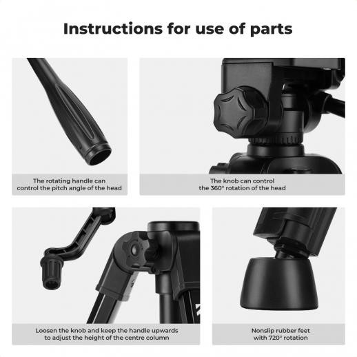 The tripod features three leg sections and a central axis adjustable from 30cm to 63cm, providing flexibility for different shooting heights. Its 360° horizontal rotation and adjustable pitch angle allow for versatile multi-angle shooting, whether in portrait or landscape orientation.