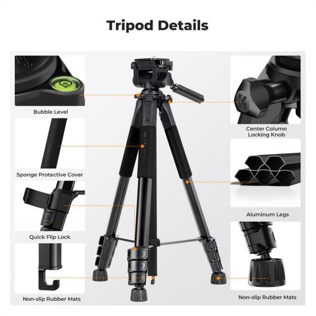 The K&F CONCEPT S254A3+BV0 tripod combines portability, stability, and versatility in one lightweight design. Featuring an innovative pentagonal tube structure with a telescopic rod, it extends from 19″ to 68″, supporting cameras, smartphones, projectors, webcams, and ring lights. Its compound triangle design, adjustable shaft, and non-slip pads ensure maximum stability on any terrain, while the quick-release plate and 360° horizontal rotation make multi-angle shooting effortless. Perfect for photography, videography, live streaming, and vlogging, this tripod is ideal for both professional and travel use.
