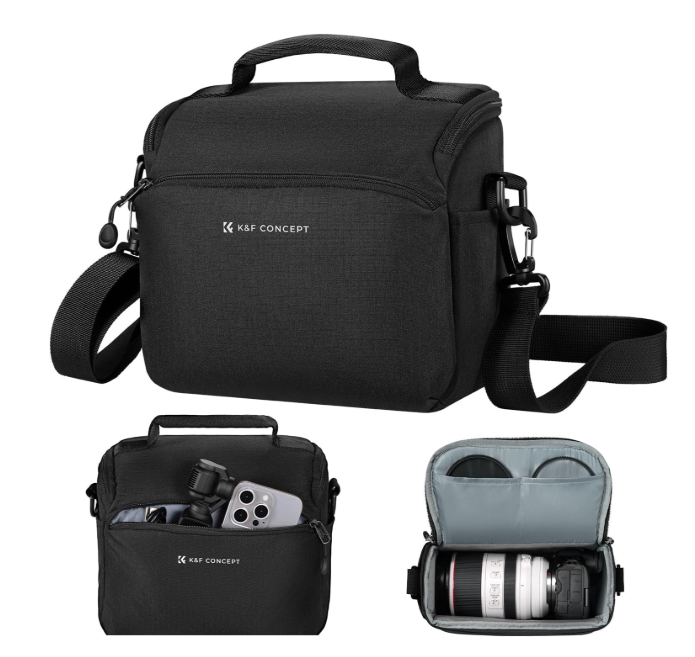 The K&F Concept Urban Wander Sling Camera Bag (5L, Black) is a sleek, ultra-light 0.61 lb crossbody essential measuring 9.1 × 7.3 × 5.1 inches externally (8.3 × 6.8 × 4.3 in internally), crafted from high-density 300D canvas with waterproofing and an included rain cover for all-weather protection. Its quick-access double-zipper wide opening, removable padded divider for customizable DSLR or mirrorless layouts, and convertible design that flips from camera bag to everyday sling make it perfect for daily commutes, outdoor travel, or short trips—complete with a 29.5–52.7 in adjustable strap and lifetime fix support.