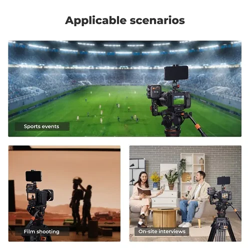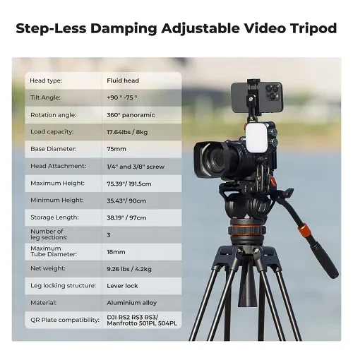 Its 3-section adjustable legs and mid-level spreader provide enhanced stability on uneven terrain, while the flip-lock mechanism allows fast height adjustments. Supporting loads up to 8kg, it’s compatible with DSLRs, mirrorless cameras, camcorders, and even cinema rigs. At the heart of this system is the BV10 Fluid Head, featuring infinitely adjustable hydraulic damping. This allows for incredibly smooth, consistent camera movements, whether you’re performing controlled pans (360° horizontal rotation) or precise tilts (+90°/-75° vertical adjustment). Achieve those professional-grade, buttery-smooth shots that truly make your video stand out.