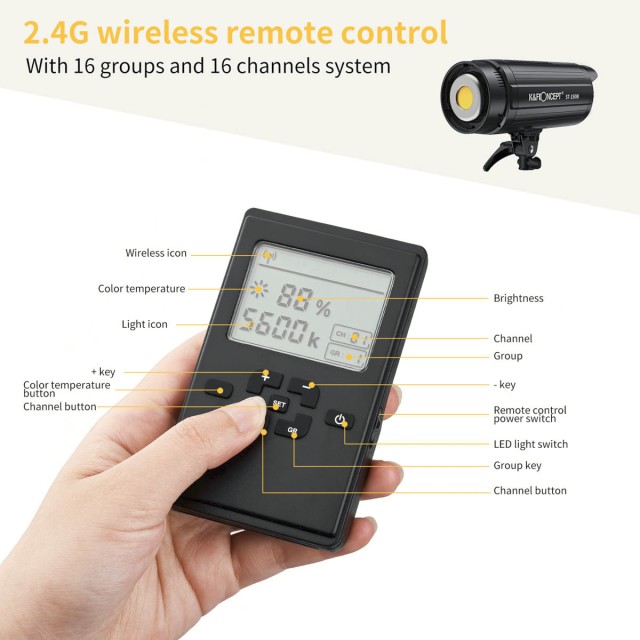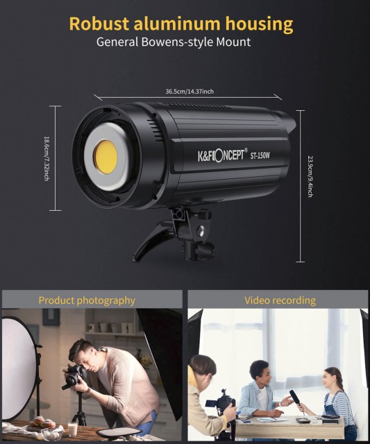 Built with a strong aluminum alloy housing, the light features an efficient heat dissipation system with a premium heatsink and ultra-quiet cooling fan, ensuring long-term stability without interfering with audio recording. The popular Bowens mount provides broad compatibility with softboxes and modifiers, while the included reflector and umbrella slot allow flexible light shaping. With its robust build, remote control capability, and universal stand mount, the K&F ST-150W is a dependable lighting tool for both studio and location use.
