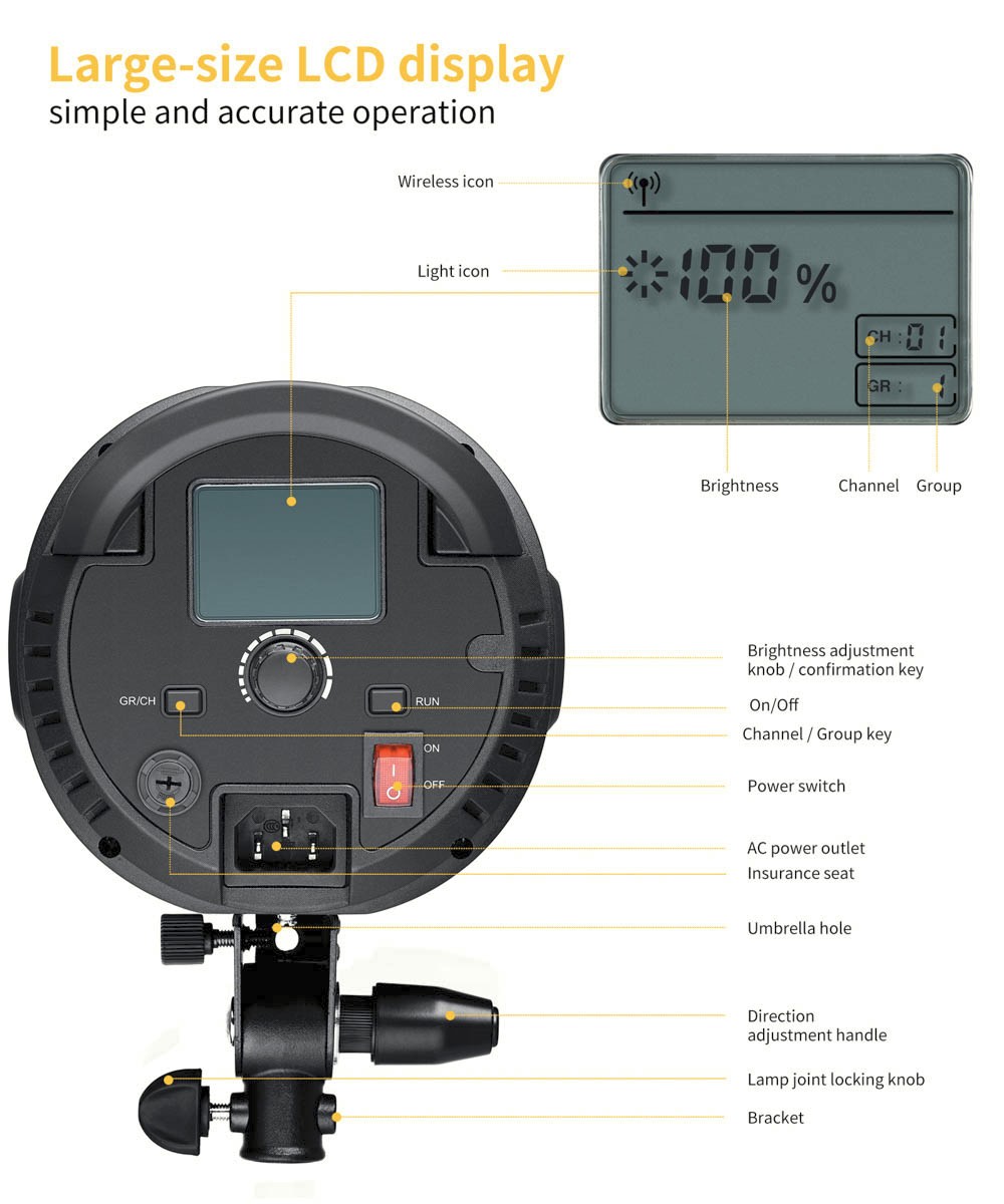 With a CRI of 95 and TLCI of 95+, the ST-150W ensures natural skin tones and accurate color reproduction. Brightness can be smoothly adjusted from 10% to 100% using either the rear dimmer dial or the included wireless remote control. A large, clear LCD screen displays brightness percentage, channel, and group settings, allowing multiple lights to be grouped and controlled simultaneously.