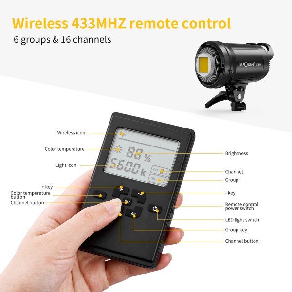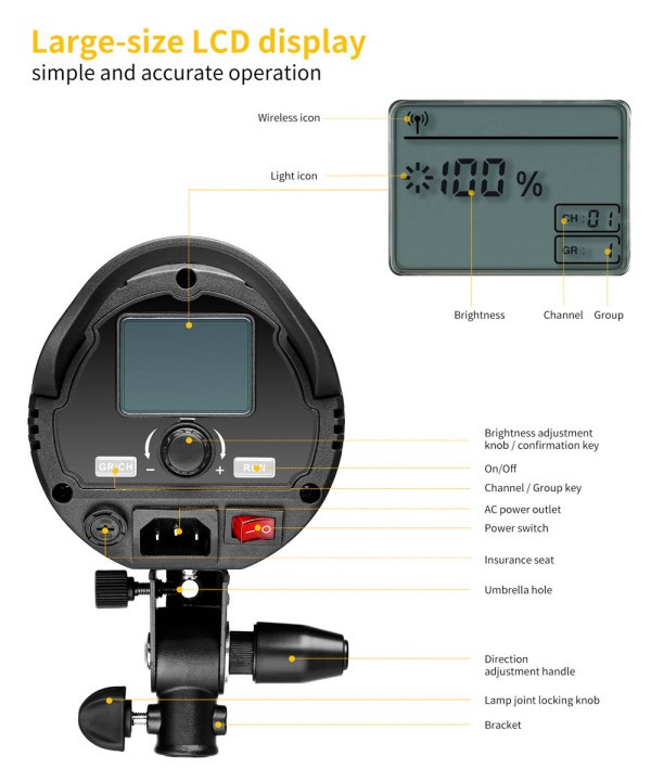 Brightness can be smoothly adjusted from 10% to 100% using the onboard dimmer or the included wireless remote control. A clear rear LCD screen displays brightness percentage, channel, and group information, allowing multiple lights to be grouped and controlled simultaneously. The Bowens mount design supports a wide range of softboxes and modifiers, while the included reflector and umbrella slot provide flexible light shaping options.