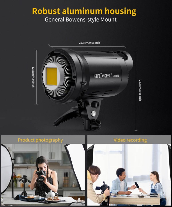 Housed in a durable aluminum alloy body, the ST-60W features an efficient heat dissipation system with a silent cooling fan, making it suitable for sound-sensitive environments. Its compact size, lightweight build, and reliable performance make it an excellent choice for creators who need professional lighting on the go.
