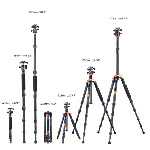 - * 【Monopod Mode】D255C4+BH-28L Carbon Fiber Tripod can be converted to a monopod in seconds: Loosen the knob and Pull out the center column that the center column can be used as a monopod.