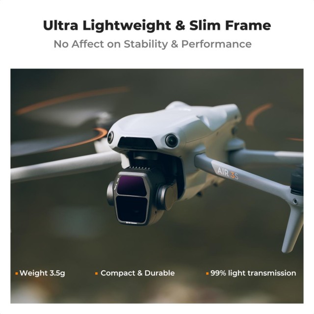 K&F Concept ND filter set specifically designed for DJI Air 3S dual cameras system, the ND8, ND16, ND32, and ND64 filter kit help reduce varying levels of light, from 3-6 stops, precise control over shutter speed, get correct exposure control in different lighting conditions, produce smooth footage. This K&F Concept Air 3S filter is made of Top AGC Optical Glass with 28-layer multi-function nanometer coatings on both sides, which helps capture vivid colors and get immersive shots, the coatings protect the filters against wear and scratches, dust, soil, and water repellent.