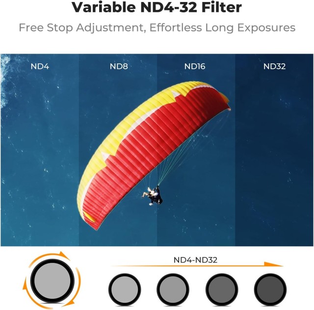 This adjustable ND filter provides stepless light reduction from ND4 to ND32 (2 to 5 stops), allowing you to fine-tune exposure in real time without swapping filters. It is ideal for bright daylight shooting, helping you slow shutter speed to achieve natural motion blur and smooth cinematic footage. The filter is crafted from high-definition optical glass to ensure excellent clarity, accurate colors, and minimal distortion.