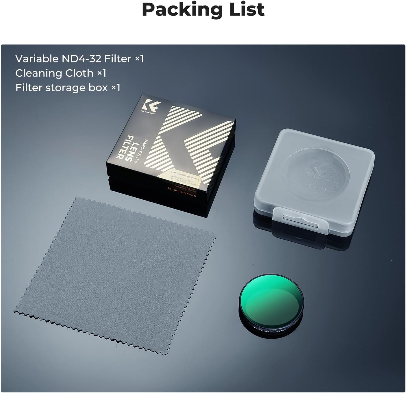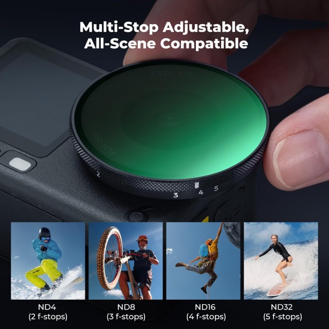 The K&F Concept Variable ND4–ND32 Filter is specifically engineered for the DJI Osmo Action 6 action camera, offering seamless compatibility and quick snap-on installation without tools. Designed to mount just like the original OEM filter, it features a secure anti-slip structure that stays firmly in place during intense movement, while remaining compatible with most cases and accessories.