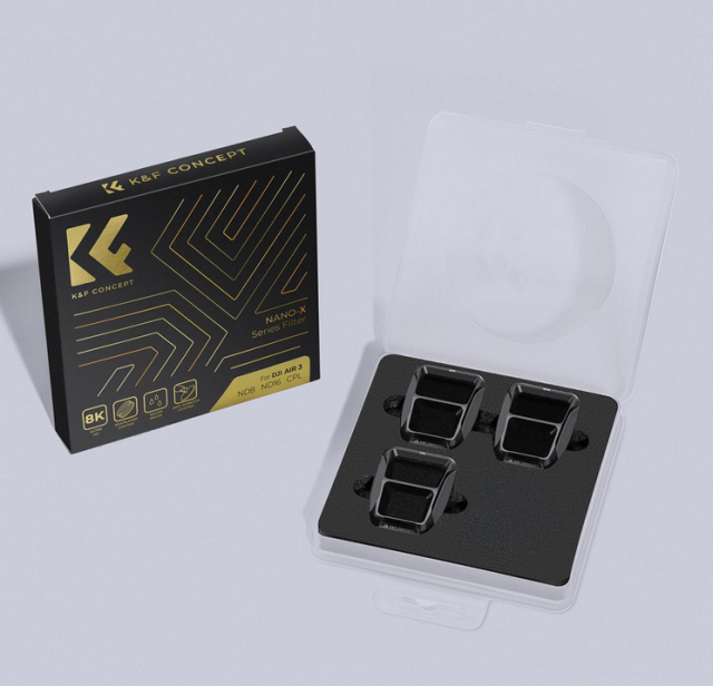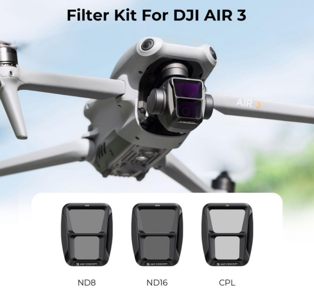 The K&F DJI Air 3 Filter Set includes CPL, ND8, and ND16 filters designed for enhancing video and image quality for DJI Air 3 users. Made from HD AGC optical glass, these filters feature 28-layer multi-coatings for durability and ease of cleaning. Lightweight and gimbal-safe, the set is perfect for reducing glare and controlling shutter speed in various lighting conditions.
