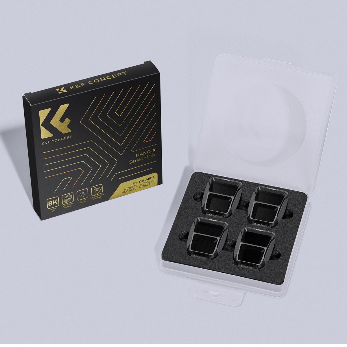 The K&F Concept DJI Air 3 ND/PL 2-in-1 Filter Set is a professional 4-piece hybrid filter kit designed specifically for the DJI Air 3 dual-camera system. Each filter combines neutral density and circular polarizing effects in one, allowing precise exposure control while reducing reflections and enhancing color saturation for crisp, cinematic aerial footage.