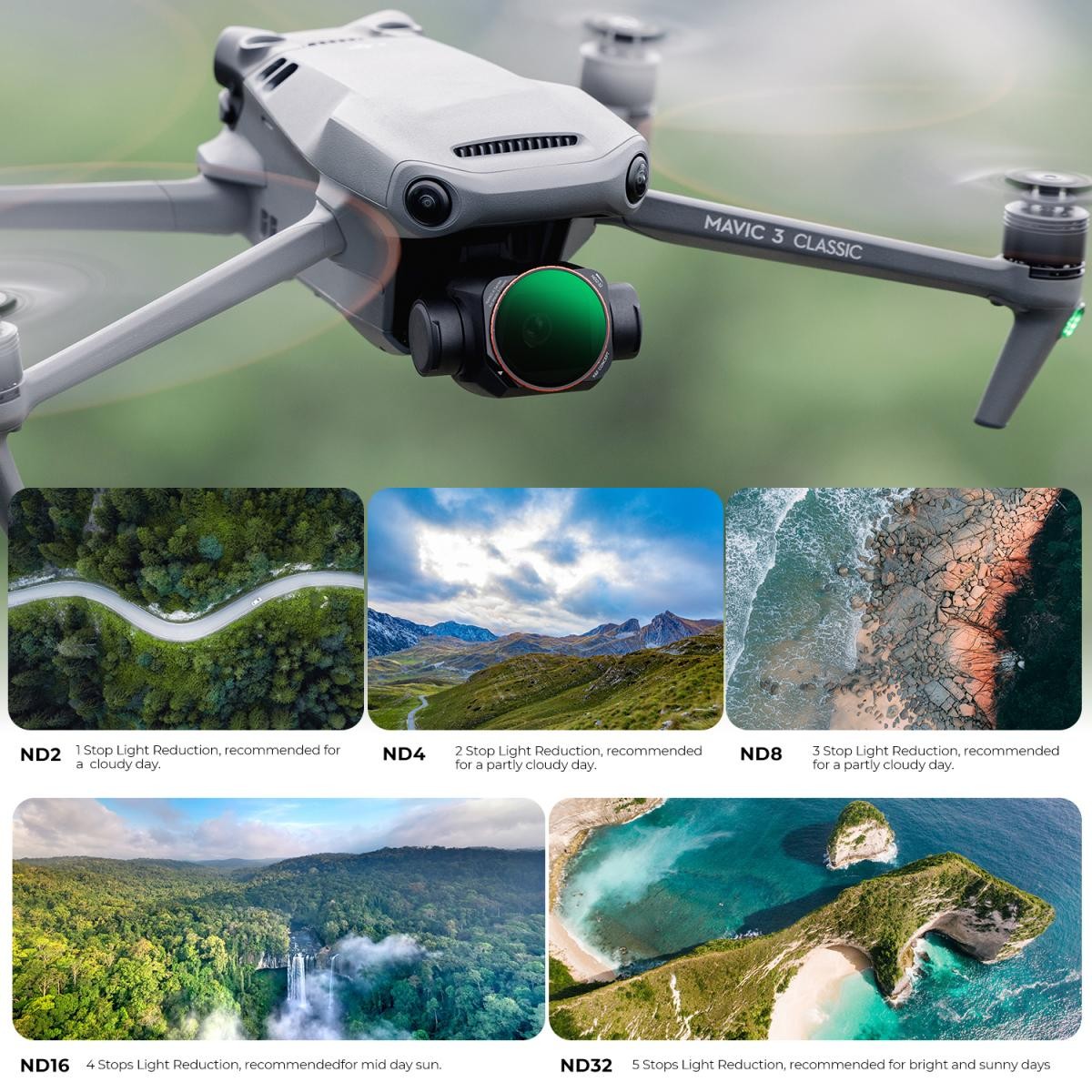 Specifically engineered for the DJI Mavic 3 Classic, the K&F Concept ND32 Filter helps photographers and videographers maintain optimal exposure in bright daylight. The ND32 filter reduces incoming light by 5 stops, allowing for slower shutter speeds and better control over motion blur without overexposing images. This makes it ideal for capturing cinematic aerial videos and detailed photos under strong sunlight.