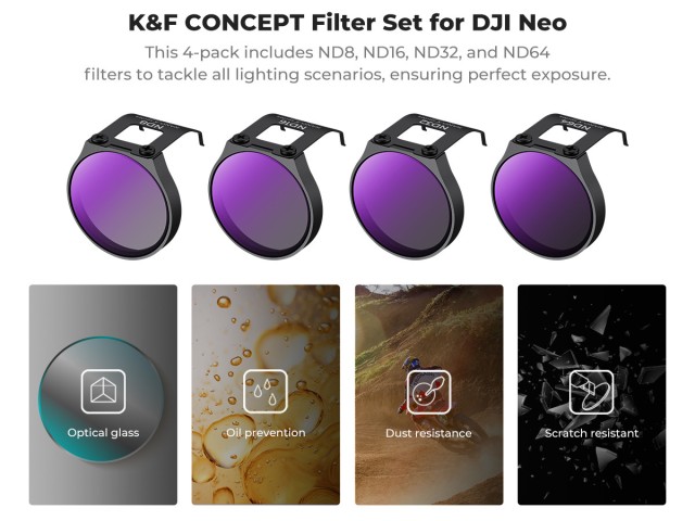 The K&F DJI NEO 4pcs Filter Kit provides essential ND and polarizing filters to improve exposure, reduce glare, and enhance color for DJI NEO drone photography, with a durable, waterproof, and scratch-resistant design for high-quality imaging in any condition.