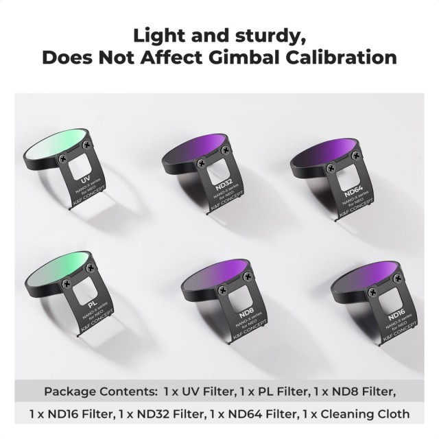 This latest ND & CPL & UV filter set from K&F Concept is specially designed for DJI NEO, each filter is lightweight to 0.5g, ensuring gimbal safety, which is made of top HD optical glass, ensures crystal clear imaging during aerial shooting. The ND8, ND16, ND32, and ND64 filter kit help reduce varying levels of light, from 3-6 stops, precise control over shutter speed, get correct exposure control in different lighting conditions, and produce smooth footage.