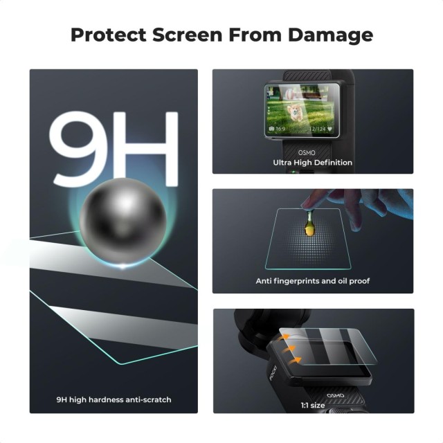 Camera Screen Protector 6pcs Compatible with DJI Osmo Pocket 3, 0.3mm 9H Hardness Tempered Glass*3 + Lens Protector*3 + Vacuum Cleaning Coth*1.T hese film kits are specifically designed for the DJI Osmo Pocket 3 Camera, including 3x Screen Protector + 3x Hot Shoe Cover, ensuring a precise and bubble-free installation.